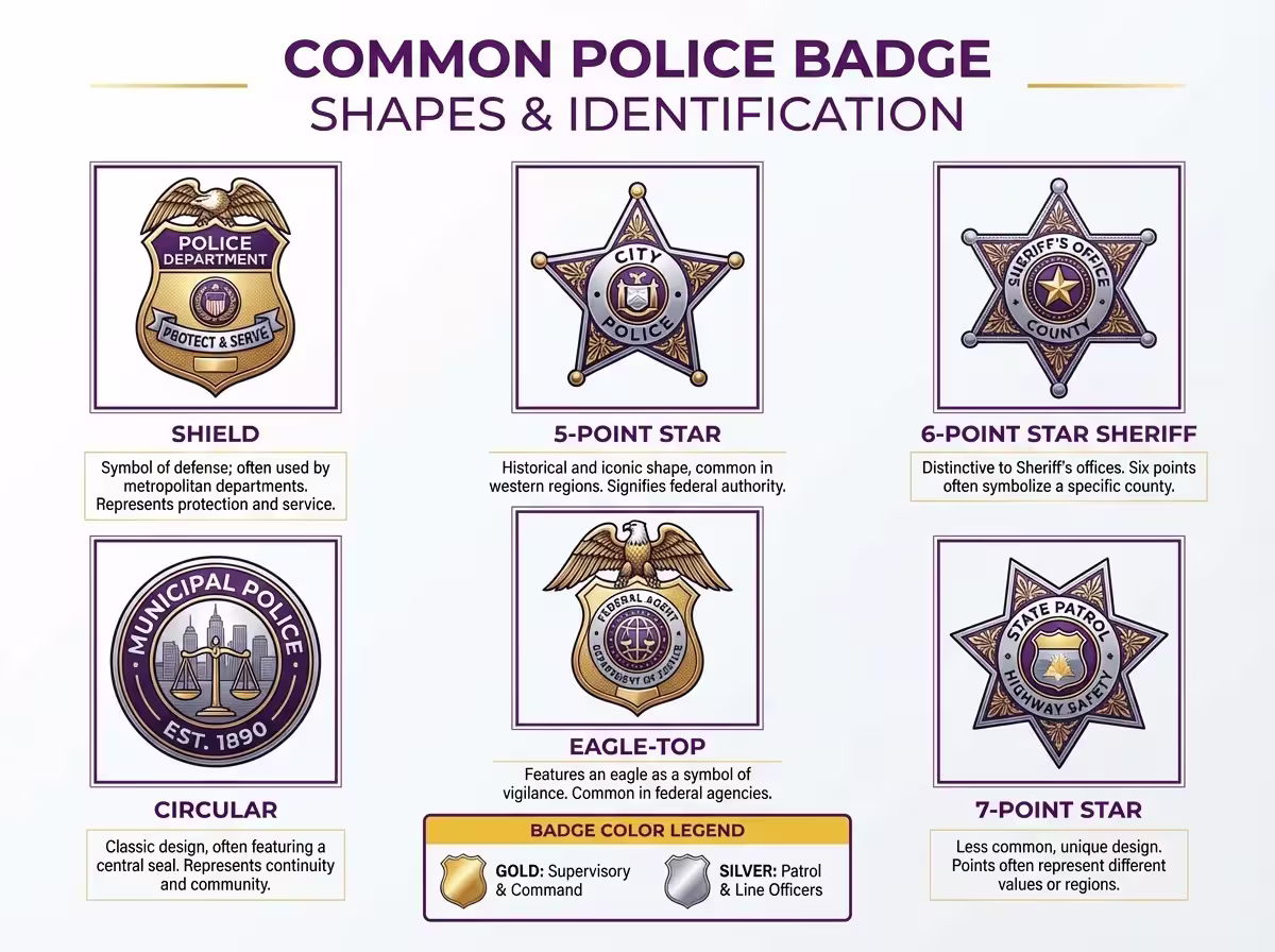 Educational infographic displaying six types of law enforcement badges – shield badge used by police departments, 5-point star for federal authority, 6-point star for sheriff’s offices, circular badge for municipal police, eagle-top badge for federal agencies, and 7-point star for state patrol, including badge color legend showing gold for supervisory ranks and silver for patrol officers