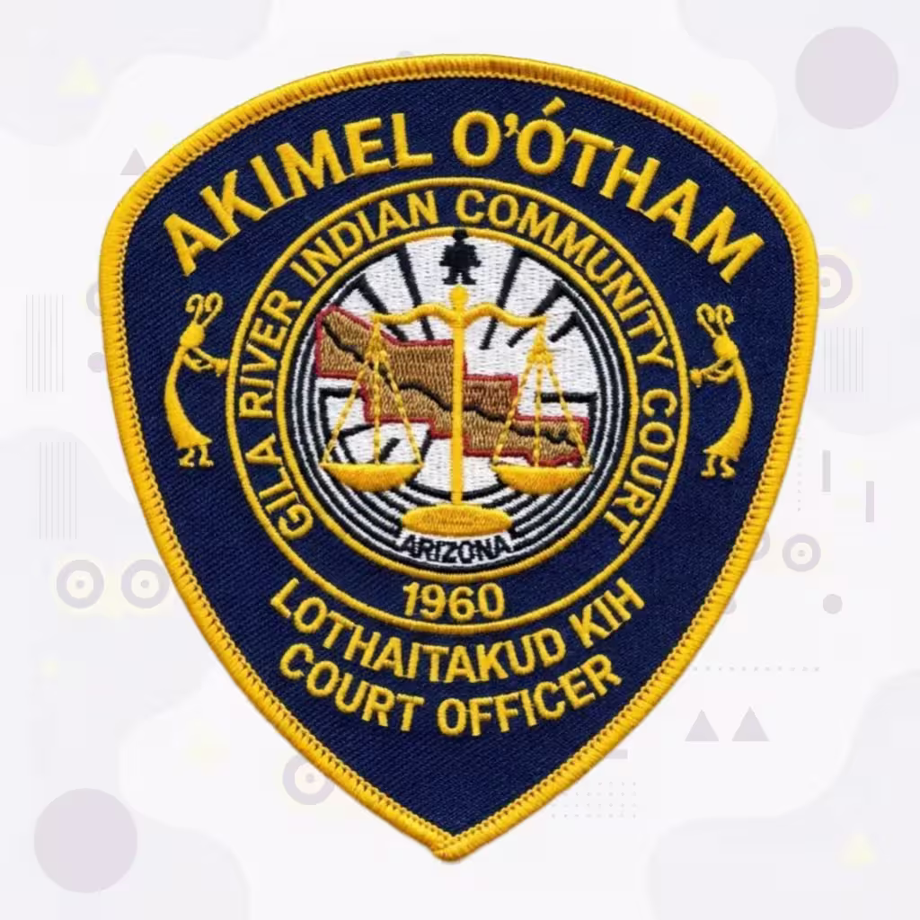 This custom embroidered patch was designed for the Akimel O’otham (Gila River Indian Community) Court Officers in Arizona, featuring rich tribal symbolism combined with judicial imagery that honors the Pima people’s sovereign court system and cultural heritage.