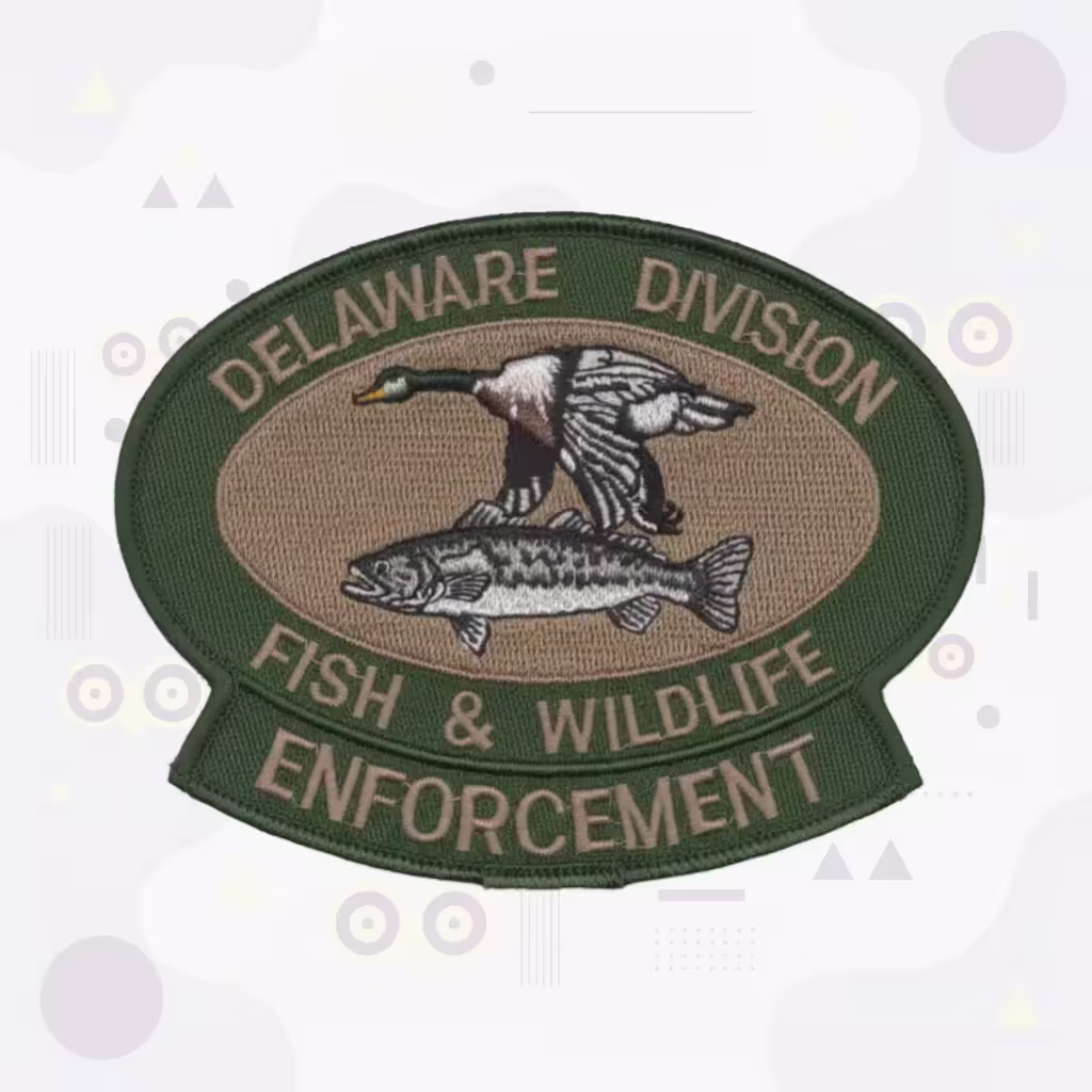 This custom embroidered patch was designed for the Delaware Division of Fish & Wildlife Enforcement, featuring iconic game species that represent the officers’ mission to protect the First State’s diverse natural resources across both aquatic and terrestrial environments.