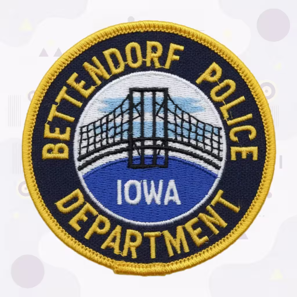 This round police embroidered patch features a bold riverside design highlighting the iconic Mississippi River crossing, designed for the Bettendorf Police Department—serving one of Iowa’s thriving Quad Cities communities in Scott County along America’s greatest river.