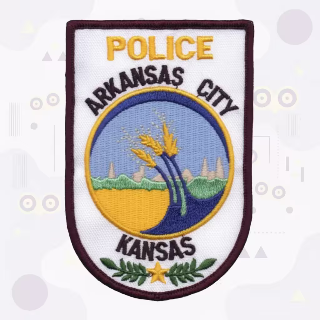 This shield police embroidered patch features a beautiful scenic design representing this Kansas community’s unique geographic location, designed for the Arkansas City Police Department—serving the Cowley County city at the confluence of the Arkansas and Walnut Rivers in south-central Kansas near the Oklahoma border.