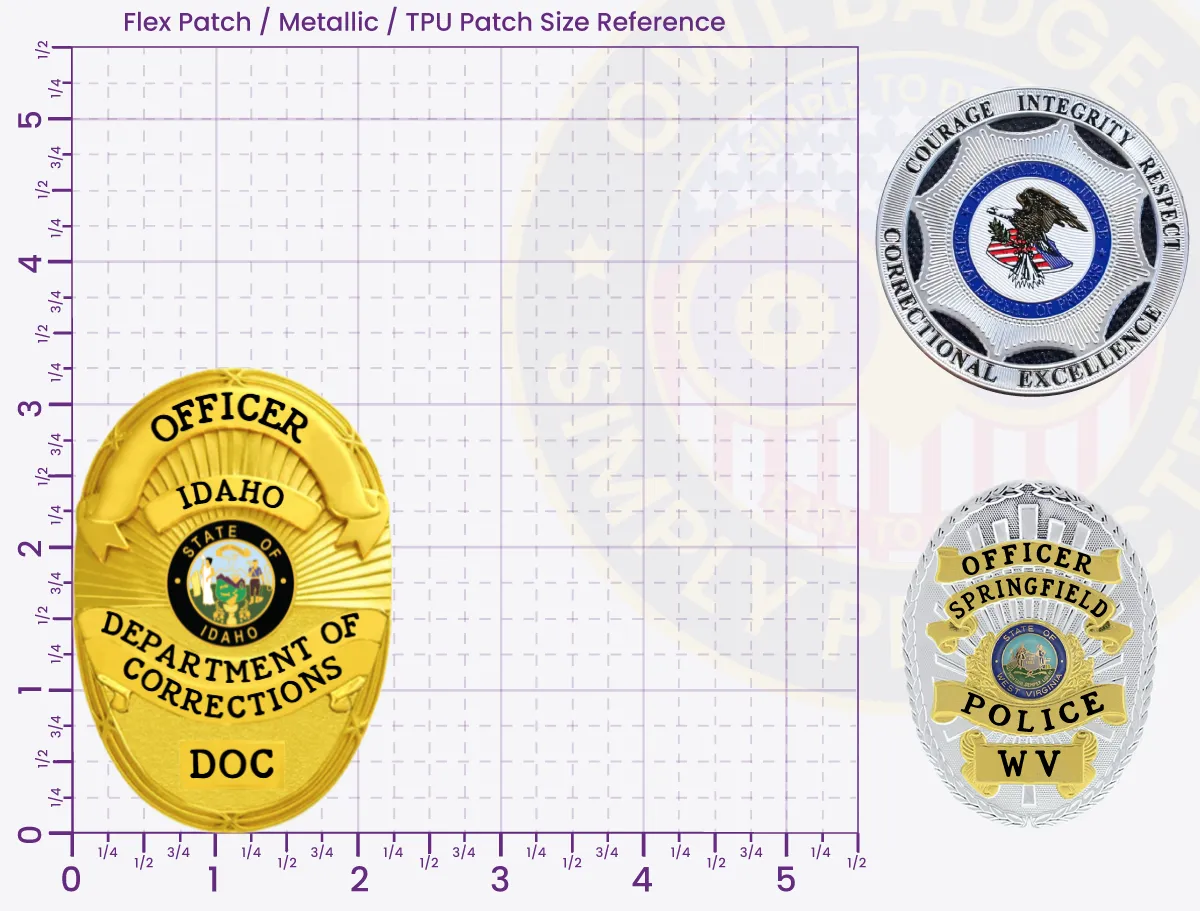 Create your corrections department badge using our online platform. Featured oval badge with 4 panels for facility name, rank designation, officer title, and ID numbers. Select finish and customize text placement. Includes volume discounts with no minimum orders. Each badge backed by 2-year warranty. Save designs or order instantly.