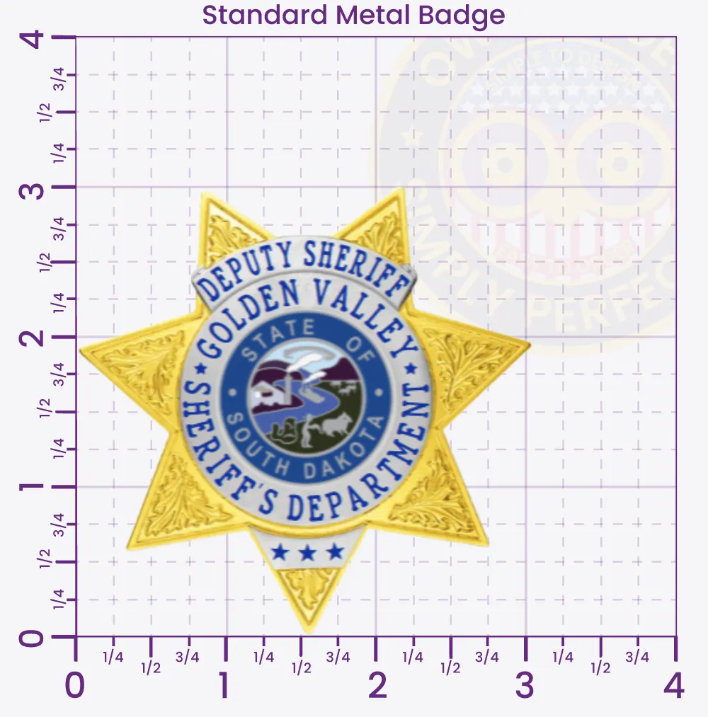 Create your deputy sheriff badge using our online platform. A 7 point star design 3 medium panels, 1 small panel and a center seal. Select your preferred finish and customize text placement. Includes volume discounts with no minimum orders. Each badge backed by 2-year warranty. Save designs or order instantly.