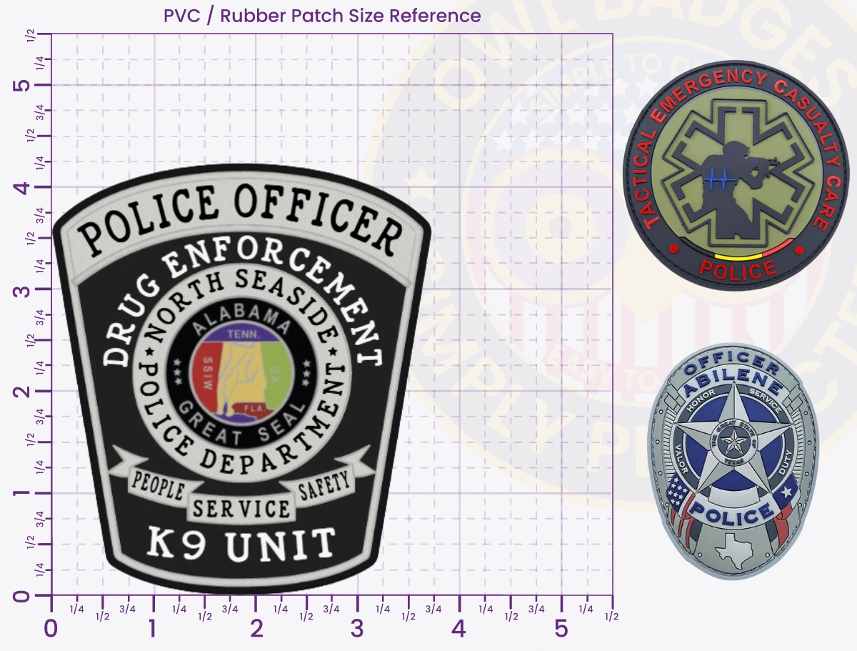 Create your department's custom police patches using our simple online designer. Tombstone shape with state seal or your logo and 10-panel layouts for agency names and unit details. Select from embroidered patch, PVC rubber patch, or flex patch. Start with 10 pieces and save on bulk orders. Design, save, and order when ready.