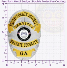 Create your private security badge using our online platform. Oval design with 4 medium panels for the private security company name, position title, officer credentials, ID numbers, and a center seal topped by an eagle and outstretched wings. Select your preferred finish and customize text placement. Includes volume discounts with no minimum orders. Each badge backed by 2-year warranty. Save designs or order instantly.