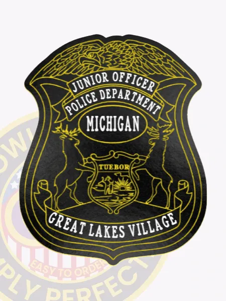 Design your custom junior sticker badges using our online design platform. Michigan eagle top badge with 4 panels and the state seal of Michigan at the center. Select your color, customize panel text, and add department details. Adjust quantity for volume discounts. Save designs or order when ready. No extra charge for custom seal. No mold/setup fee.