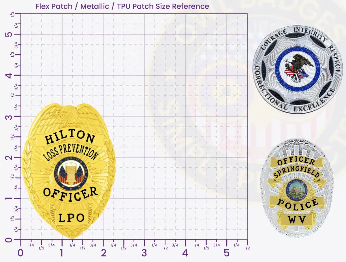 Create custom Loss Prevention Officer Badges with our user-friendly online designer. Badge features a bald eagle top, 4 customizable panels, decorated with laurel leaves, oak leaves, and acorns. Choose your metal finish, add titles, ranks, and custom text. Enjoy volume discounts with no minimum orders required. All badges include our 2-year warranty. Save designs or order instantly.
