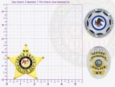 Create your department police badges using our online platform. 5-point star badge with rounded points and 3 panels for department name, rank designation, and badge numbers. Select finish and customize text placement. Includes volume discounts with no minimum orders. Each badge backed by 2-year warranty. Save designs or order instantly.