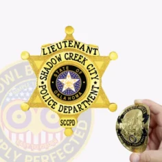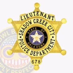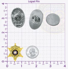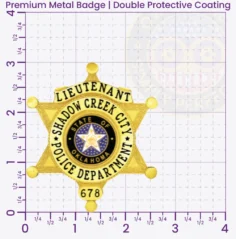 Create your department police badges using our online platform. 6-point star badge with rounded points, top ribbon banner and 4 panels for department name, rank designation, and badge numbers. Select finish and customize text placement. Includes volume discounts with no minimum orders. Each badge backed by 2-year warranty. Save designs or order instantly.