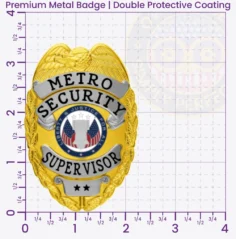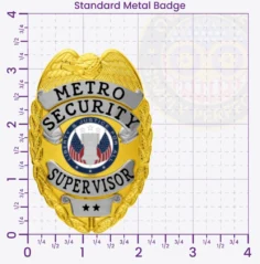 Create your security officer badge using our online platform. Eagle top design with 4 panels for company name, position title, officer credentials, and ID numbers. Select finish and customize text placement. Includes volume discounts with no minimum orders. Each badge backed by 2-year warranty. Save designs or order instantly.
