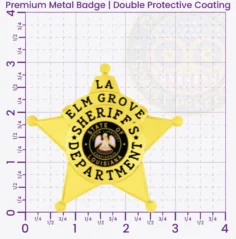 Create your sheriff department badge using our online platform. Round design with 5 point star, with panels for department name, rank designation, county details, and badge numbers. Select finish and customize text placement. Includes volume discounts with no minimum orders. Each badge backed by 2-year warranty. Save designs or order instantly.